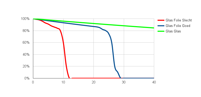 Wij zijn groot voorstander van het gebruik van glas-glas panelen. Normale panelen hebben glas aan de voorkant, maar kunststof folie aan de achterkant. Dat beperkt de levensduur, omdat de folie uiteindelijk (na 10 tot 25 jaar) vocht doorlaat en dan gaat het paneel uiteindelijk stuk. Glas-glas panelen hebben een achterkant van glas en hebben bovenstaand probleem dus niet en hebben een levensduur van 40+ jaar. En ze hebben enkele andere voordelen, zoals: - Beter bestand tegen mechanische krachten (stoten bij installatie, hagel, wind, etc.)